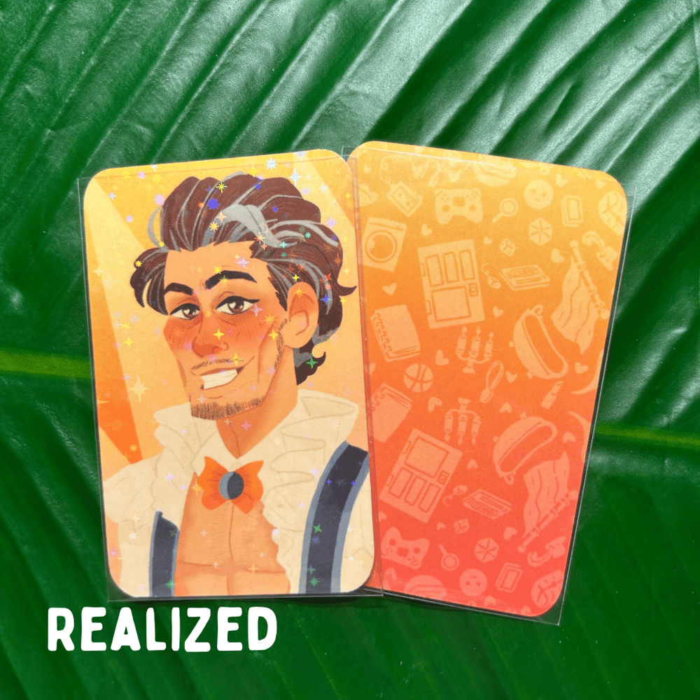 Made with matte photo paper, holographic and clear laminate. This card is double sided and comes with a plastic sleeve.